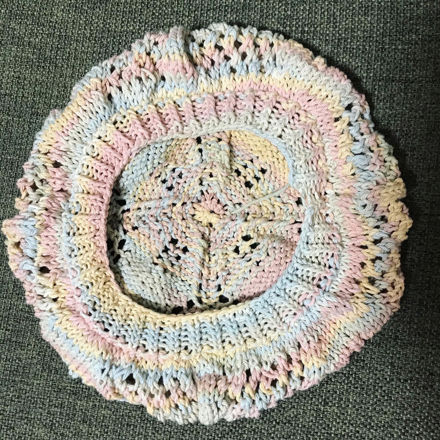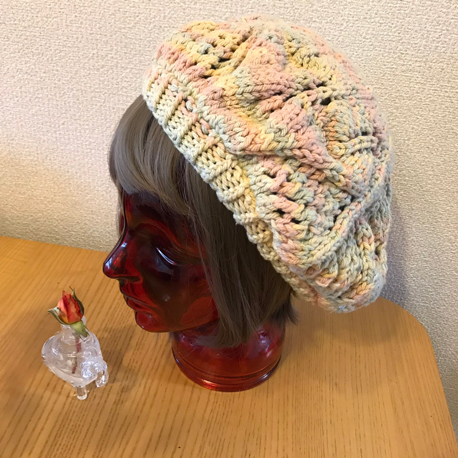 レシピに書いてあるよりも模様編み部分を早めに切り上げて完成したら、こんな感じになりました。写真でみると良い感じなんですが被ってみるとやっぱり大きい。普通に被って目が隠れてしまうくらい。